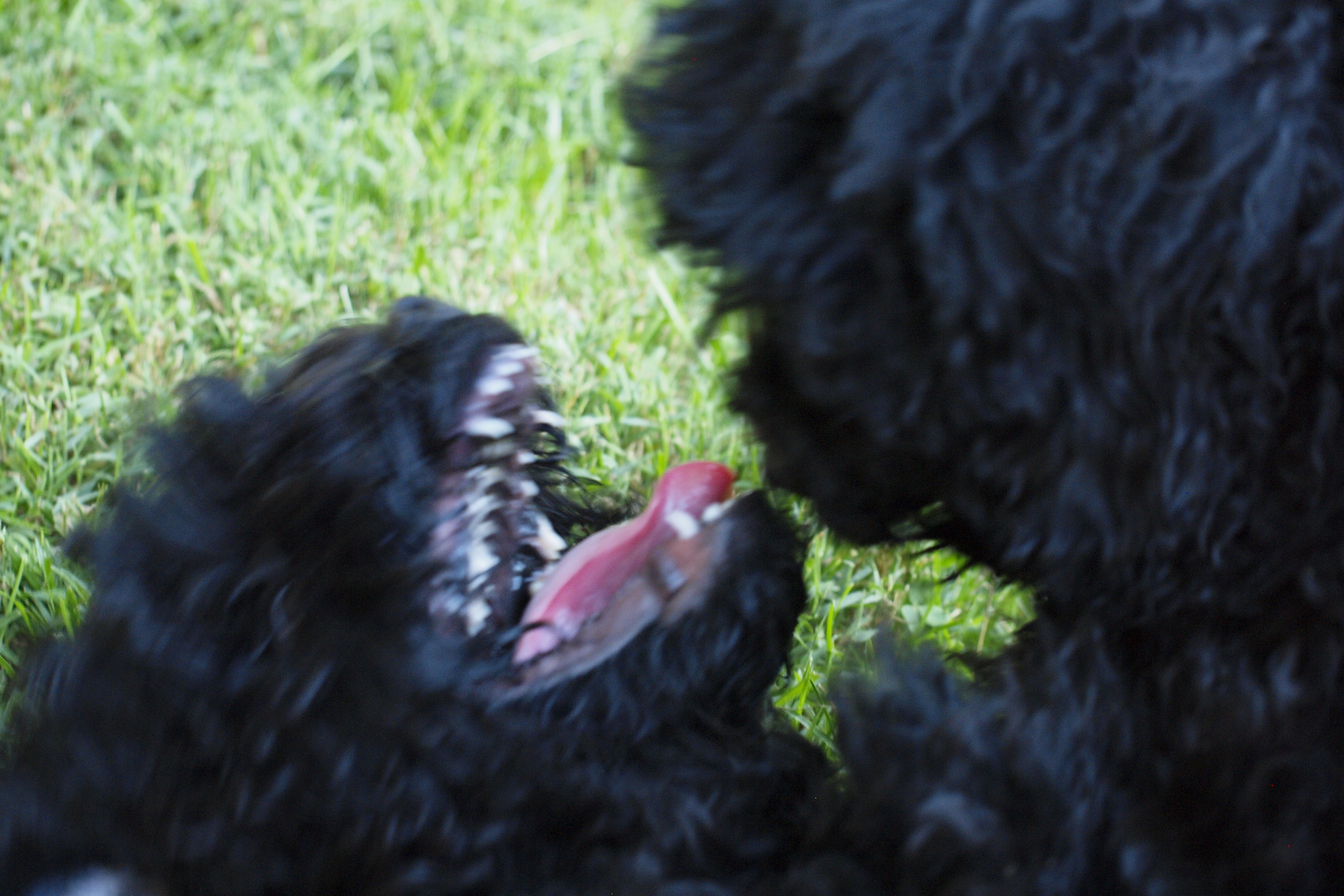 This morning, they had their first outdoor dining experience at Art Cafe. Their girlfriend — Lula the Frenchie — was there with her parents, which helped ease the pups into the new experience. Uncle Victor works there, too, so he provided another familiar face to welcome them. The pups were really good, gently sniffing at the children who Lula knows and remaining pretty calm the whole time. There was some playful barking at Lula, but nothing got out of hand. (Sassa was brought to sit on Dez’s lap when he started to get too excited, which calmed him.) Nick opted to skip breakfast (sleepy head!) so Dez walked the pups and wrangled them on her own. Alas, there was no heeling this outing… but the pups were great at making macrame of their leashes when walked together!