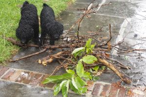 The boys went on a big walk around the neighborhood, where Ouzo “heeled” at Nick’s feet the whole way! (DezandNick haven’t even started training “heel” — we’re just happy to have them walking on the leash at this point. Ouzo is clearly a genius at The Walk, now that he’s overcome his fear of the leash.) Cars, buses into Manhattan and motorcycles were of interest, but not too distracting or scary.