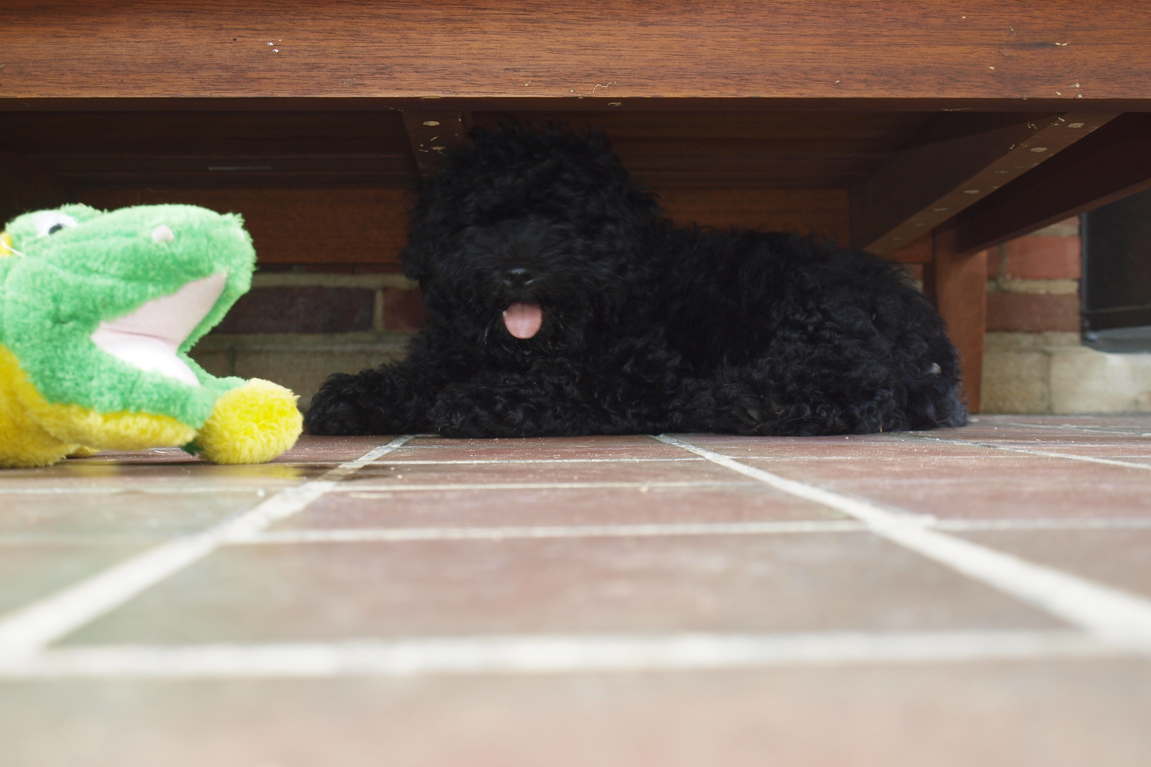 Uzi loves to hang out under the couch — indoors or out.  He’s already grown to the point where getting under the living room couch is a tight fit, but he still has several inches clearance on the patio couch. For now…