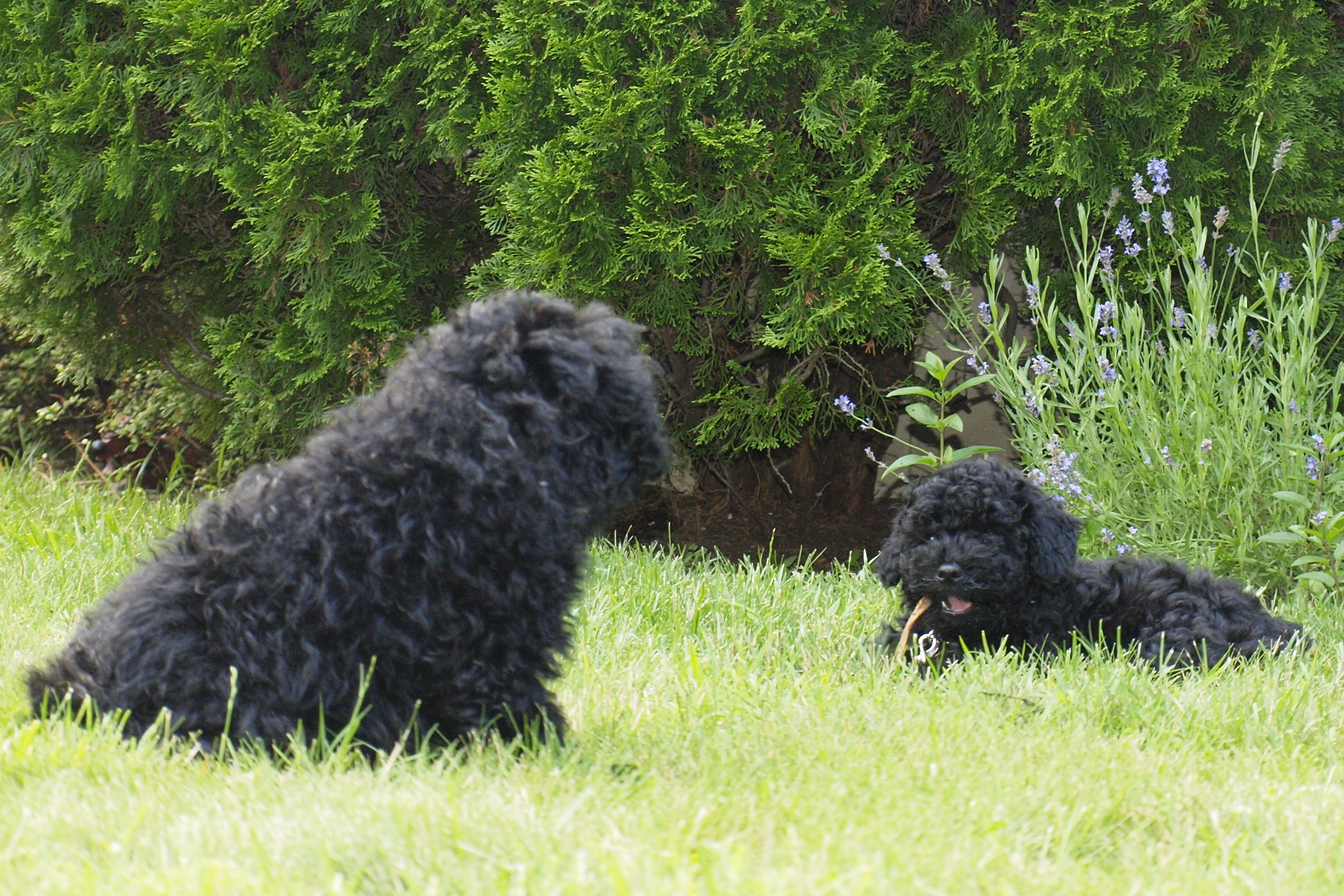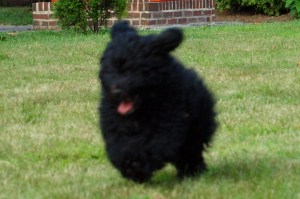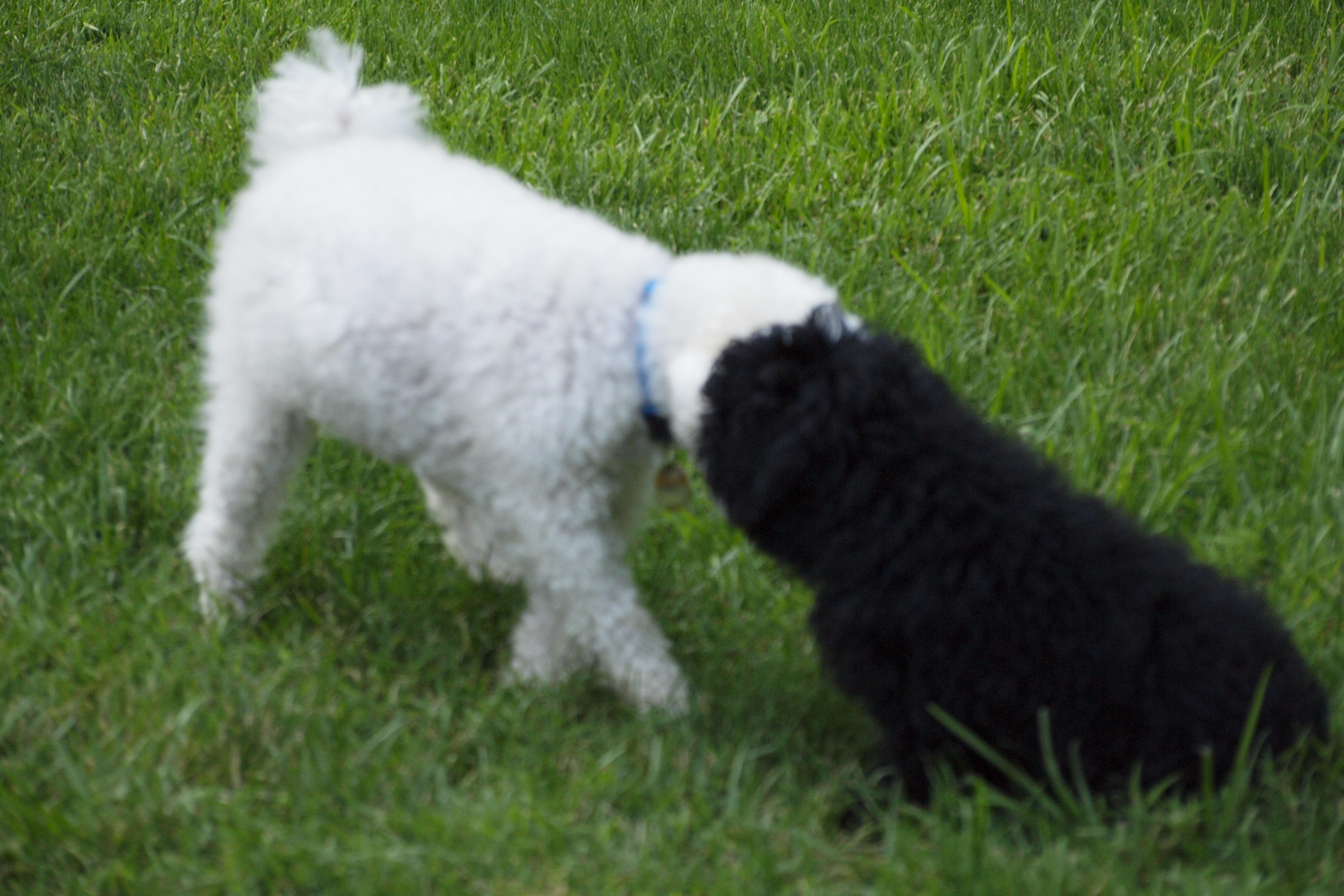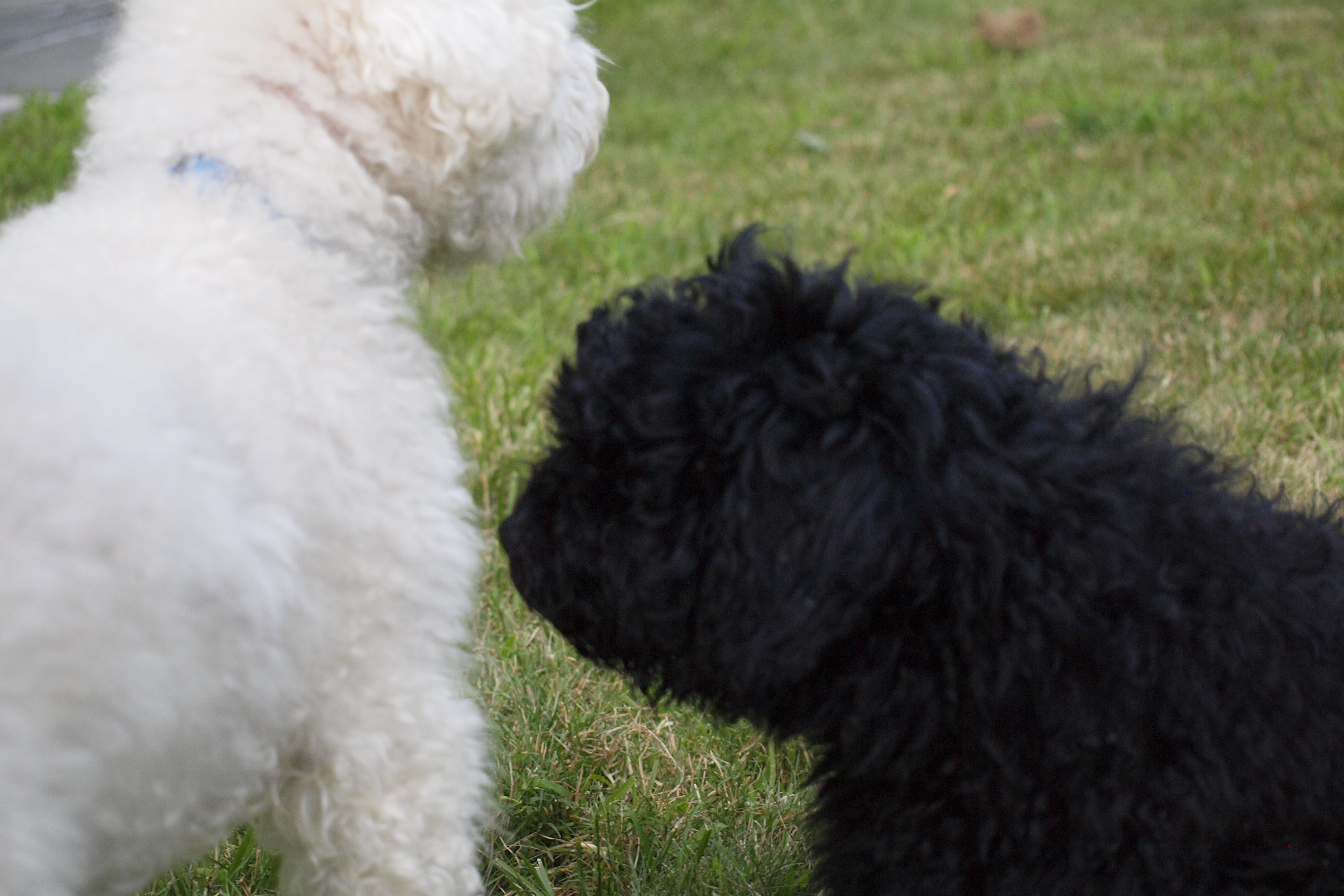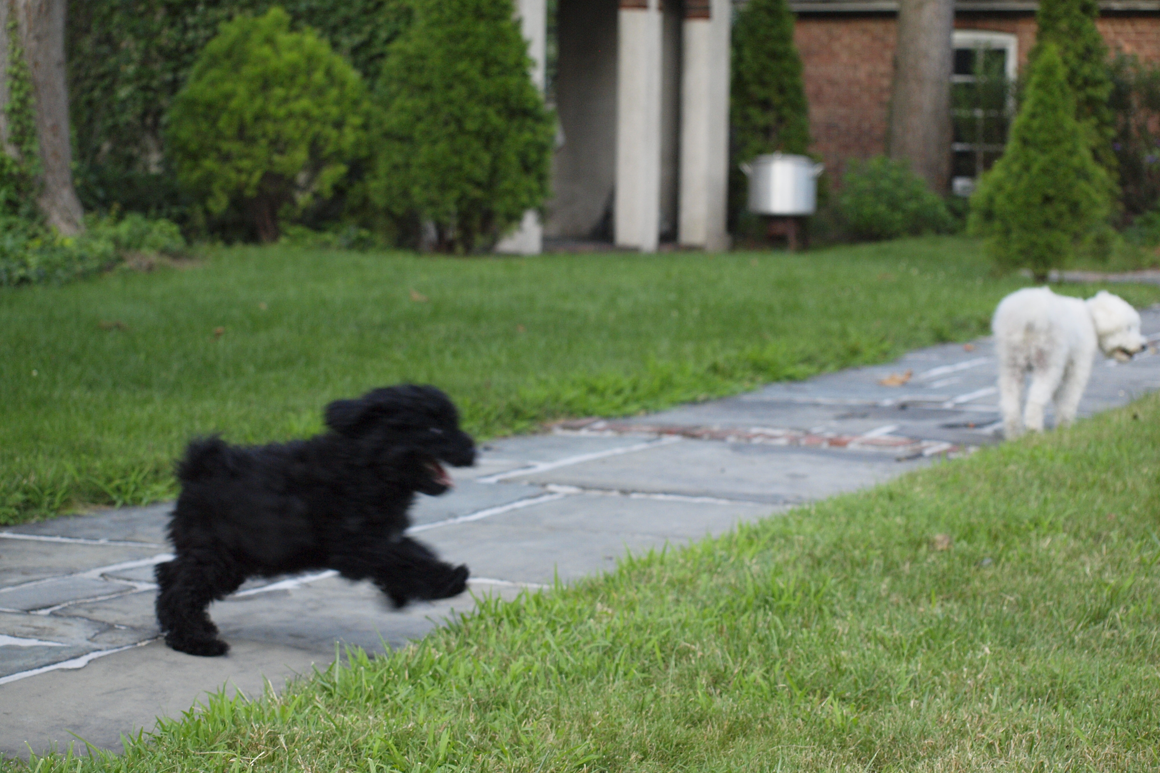 Since meeting Lula, the French Bulldog,  the boys have had several more play dates. Della, the yellow lab — one of Grandpa Sam’s best friends — has been over several times.  She’s older and not as inclined to play, but her calm energy and patience with the pups is wonderful.  Blu, the puppy Great Dane, stopped by a couple weekends ago, but even as a pup, she was very great in stature… more like a small pony than a dog.  The pups were very shy around her.  (DezandNick felt badly because Blu was so interested in playing with the boys.  We’ll try again when the Uzi & Sassa have grown a little.)   And most recently, Bailey, the cock-a-poo who lives next door, came over for a visit.