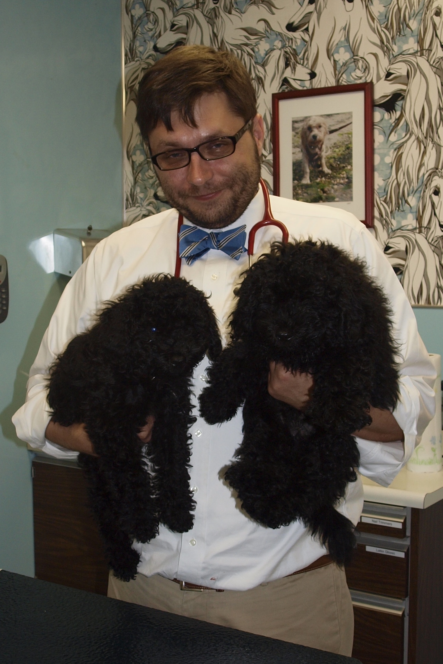 The pups had a meet-and-greet with the Vet last weekend.  Nothing trauma-inducing, just a quick hello and a once over (well, there were 2 pups, so perhaps a twice over).  At 10 weeks, Sassafras is 9 lbs and Ouzo is 10 lbs (although he’s fluffier and looks much bigger). We have doggie-care game plan for strong, healthy pups — just like the Grandpa Sam was.