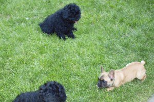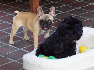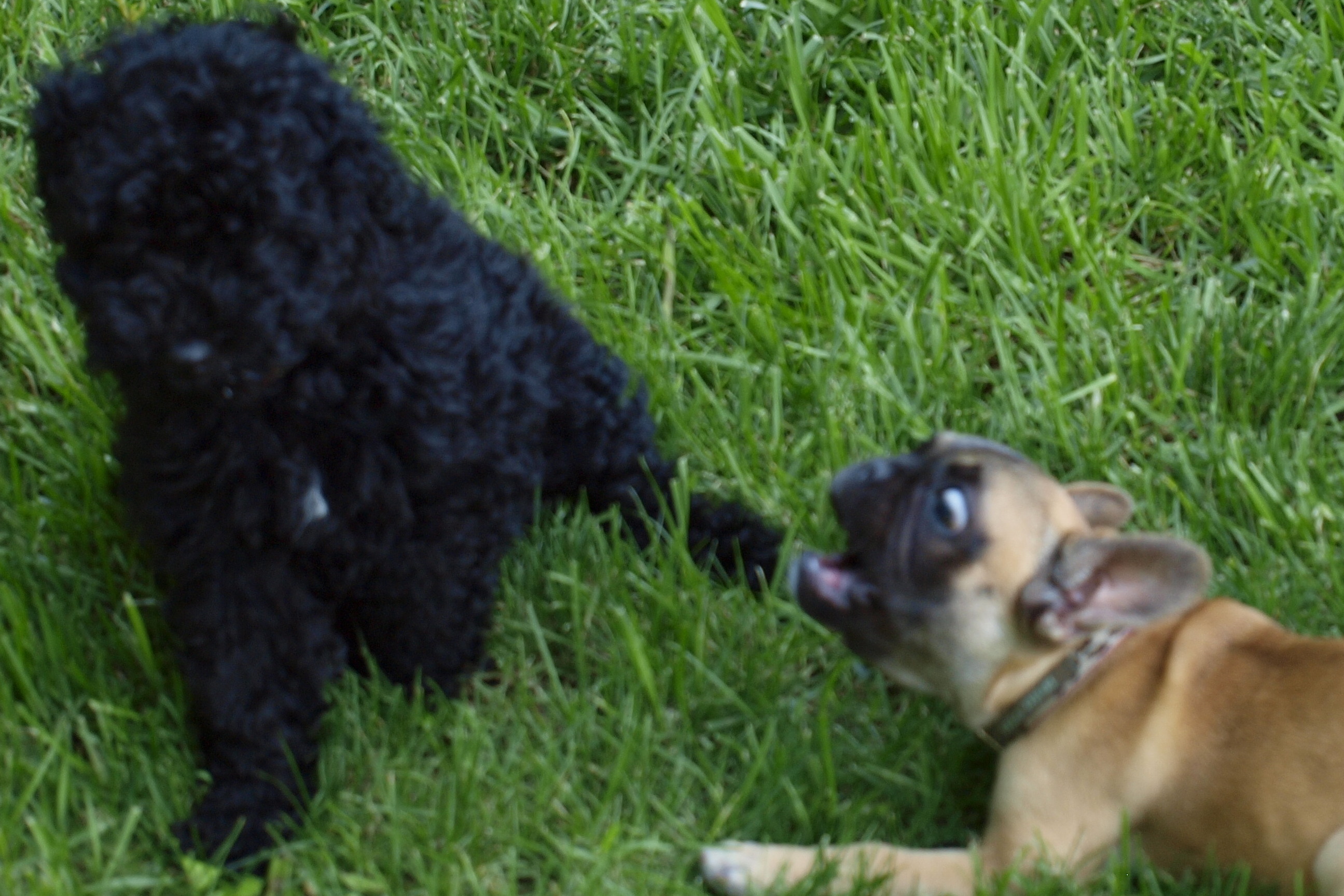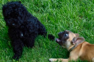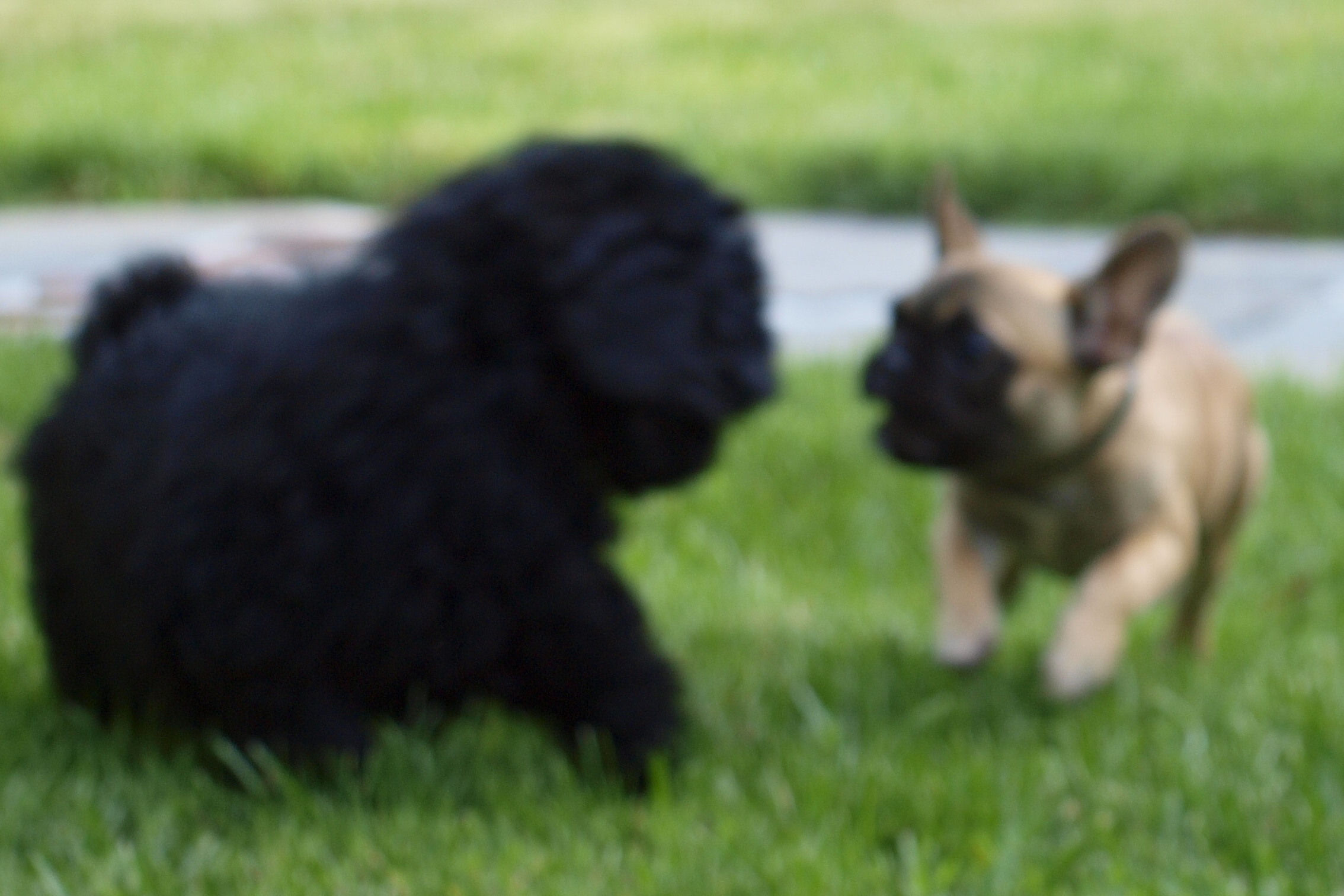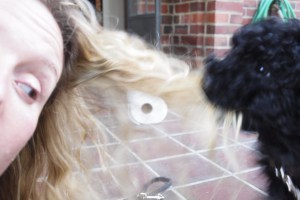 DezandNick clipped the pups’ toenails and gave them their first bath & hair-dry. (Well, the breeder did that, too, but this was OUR first.) Wish we could share photos with you but our wet, soapy hands were full, as you might imagine. Uzi went first and he was a real sport about it. He tried to bite the water coming from shower head and eat the air from the blow drier. He loved being swaddled in towels and blow dried — thought it was a big game with lots of rubs. Sassa was more trepeditious about the whole process. He tolerated the bath, right up until the final rinse when he started whining a little. (DezandNick worked as fast as possible — luckily, Sassa reached his limit right as it was finishing.) He allowed the blow dry to happen, but mainly because DezandNick locked him in a small room where he couldn’t get away, then bribed him with puppy treats. We’ll try to get photos next time, because wet Puli pups are pretty goofy looking. Once all that hair gets wet and deflates, you can see their great big paws.