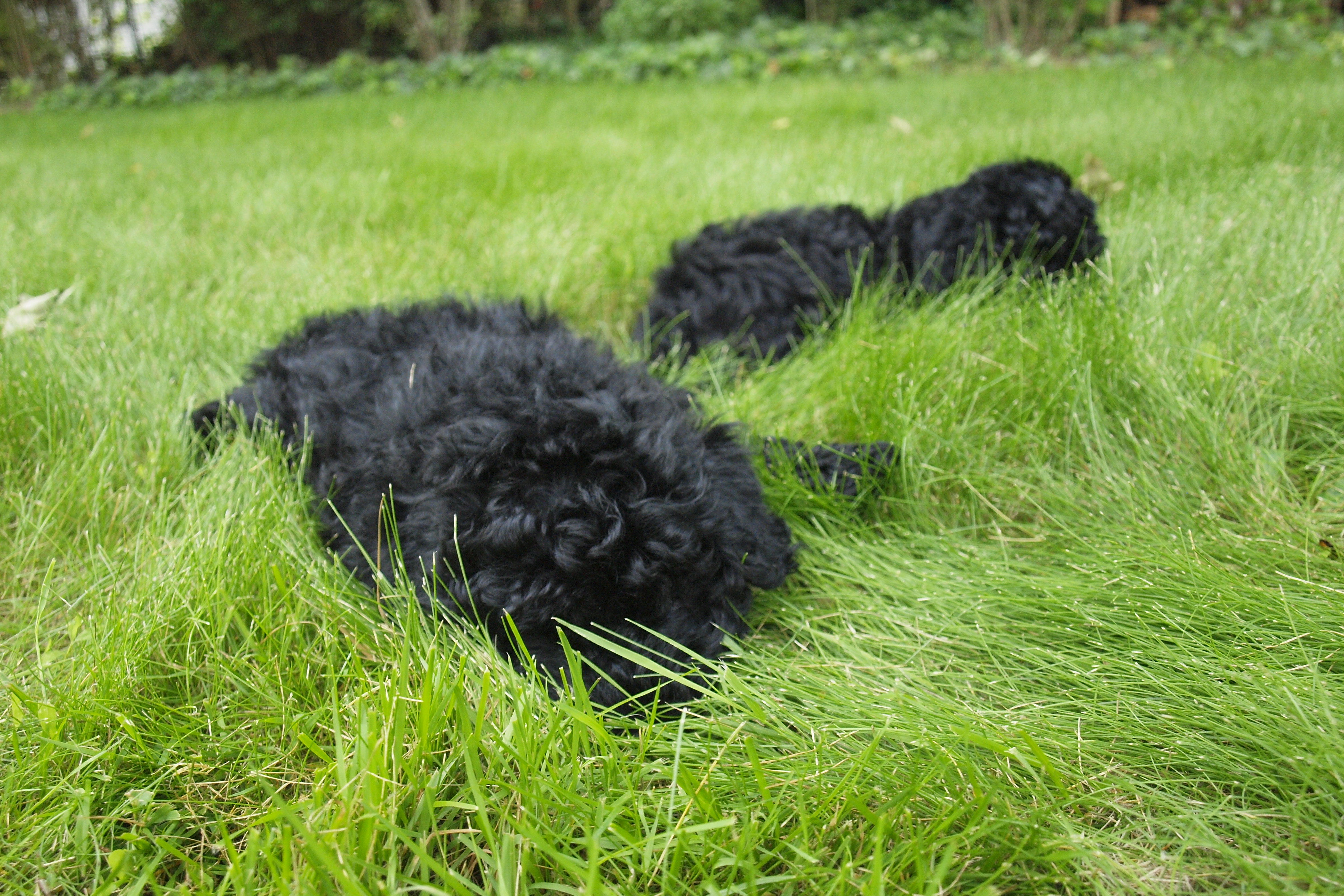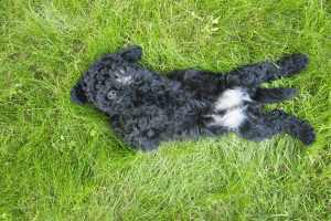 The boys handled the massive thunderstorms last week with grace. Frankly, they didn’t seem to notice the lightening, thunder, dark skies or rattling gusts of wind. And they have no objections to being wet. As comfortable as they were with Mother Nature’s noise and wind, they’re not so sure about the Hair Dryer. Getting comfortable around the Hair Dryer will be important before their “dreadlock” cords start to form, so this weekend we introduced the pups to the Hair Dryer. They are [now] okay with the noise, but not so sure about the “wind” that comes out of it. Ouzo was less concerned and walked into the blast of warm air, but didn’t linger. Sassa was skittish about it. We’ll stick to towel drying for now, but will continue to work with the Hair Dryer until they’re more confident about it.